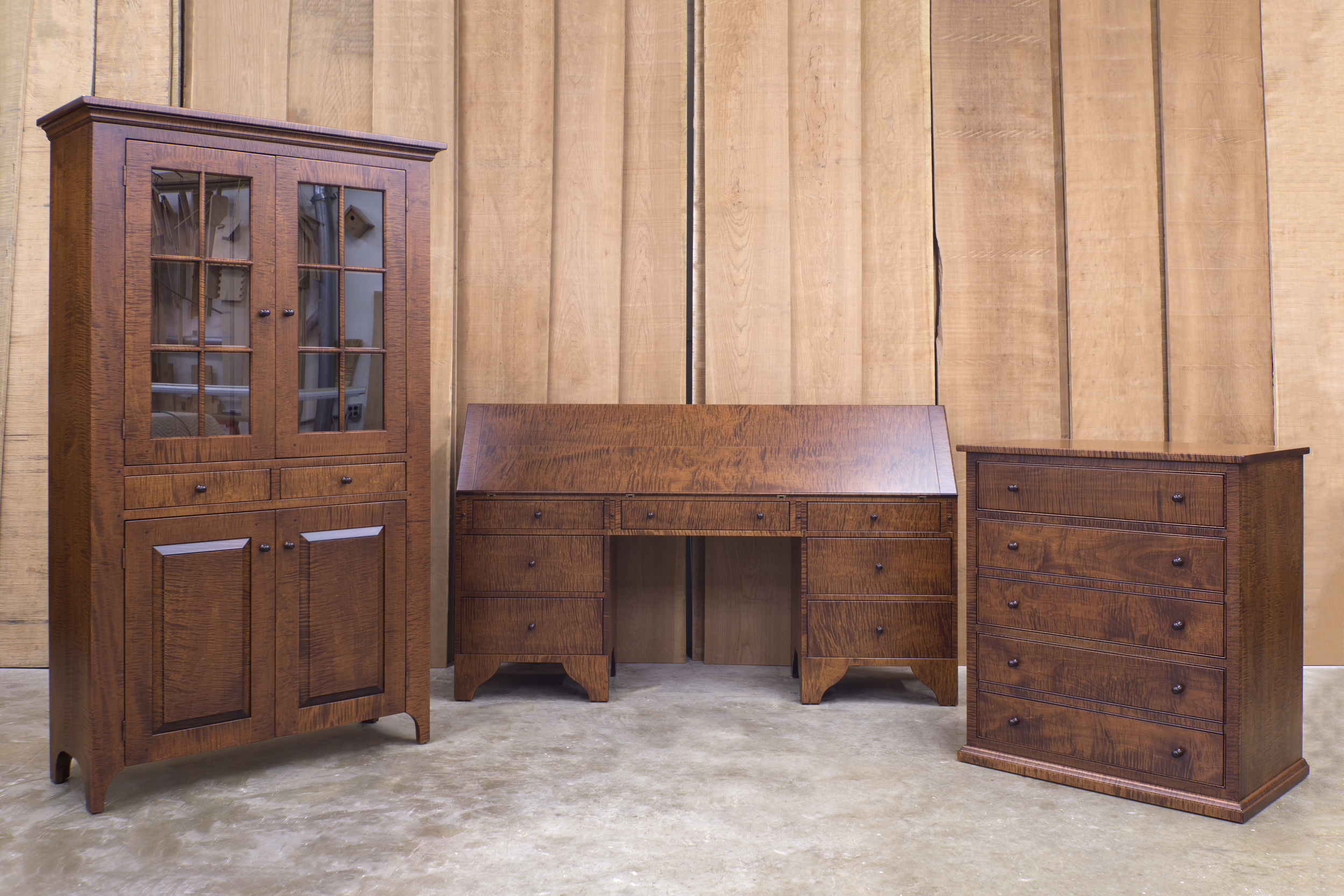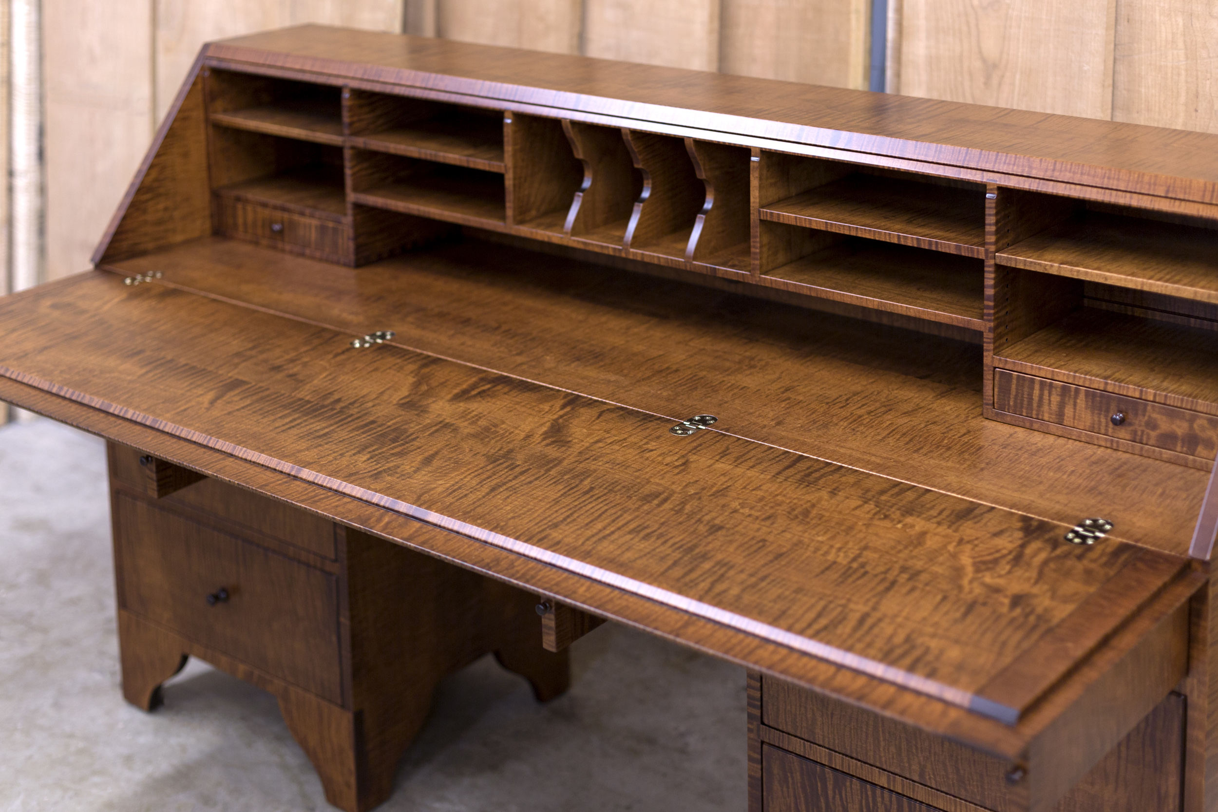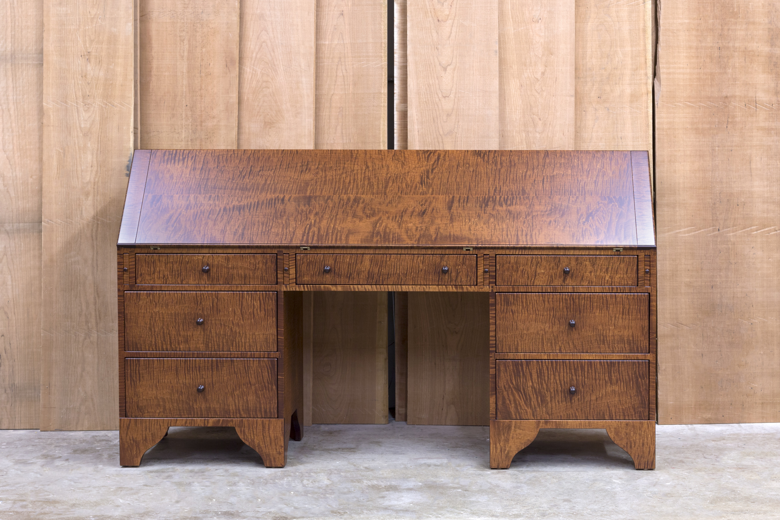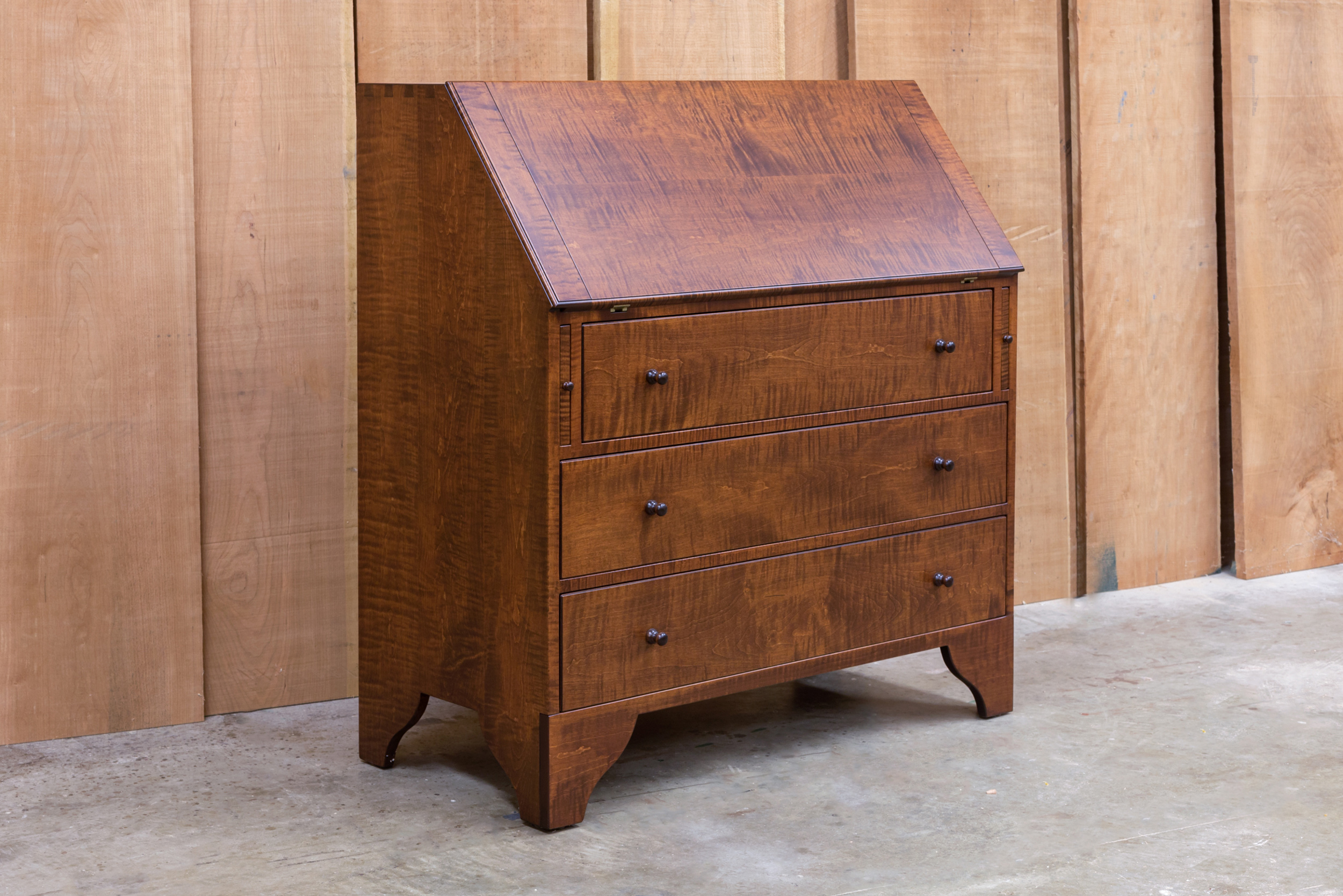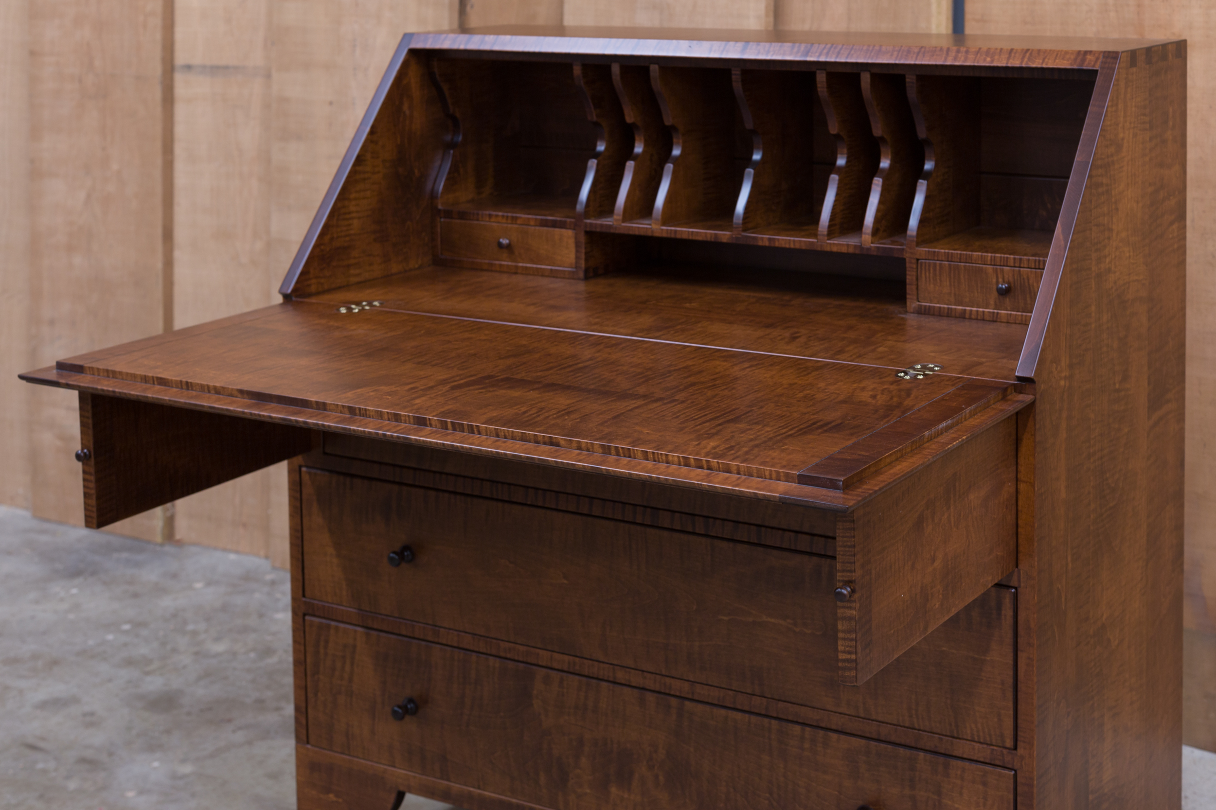 Slant Front Desk built out of Tiger Maple wood in our Cinnamon finish
