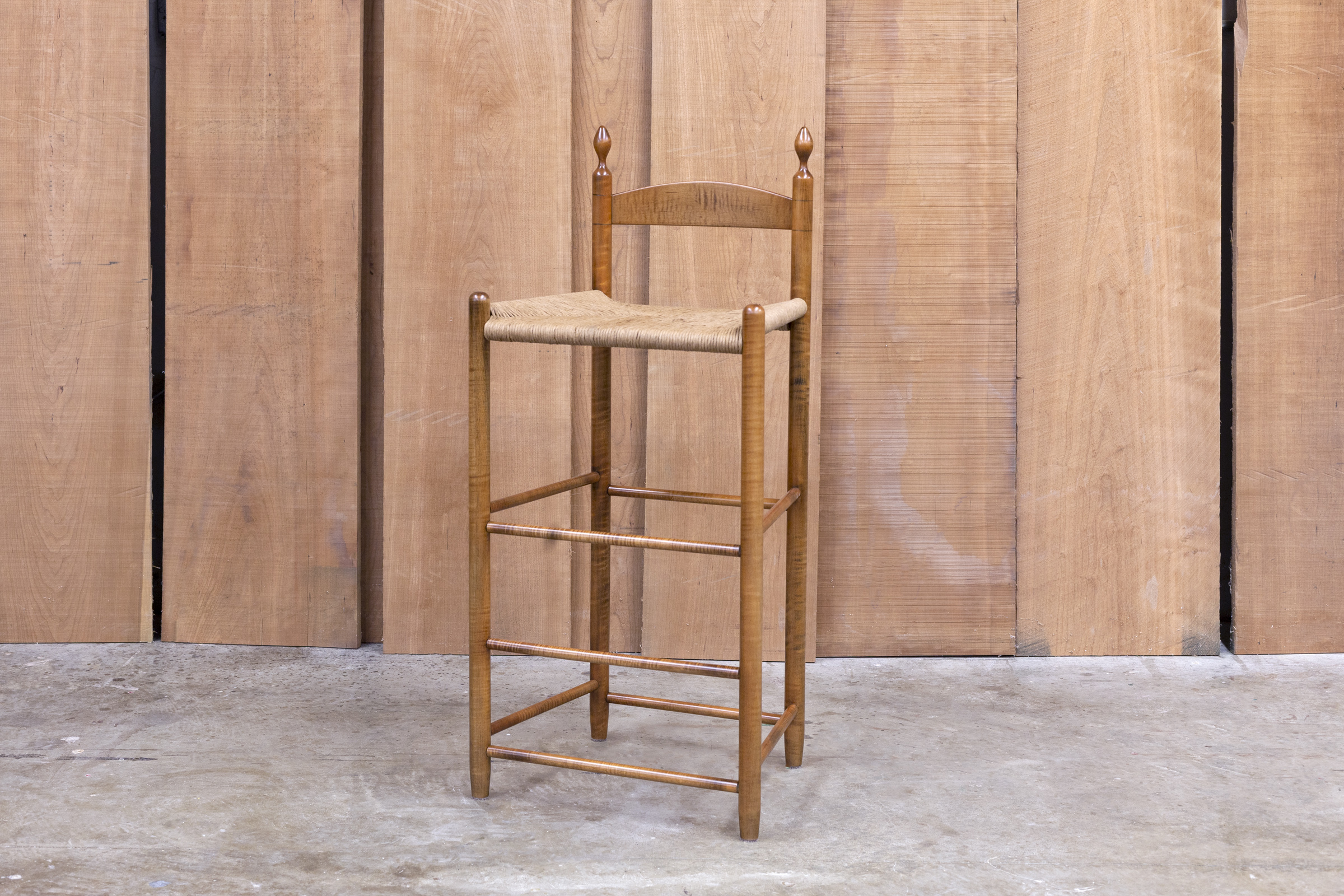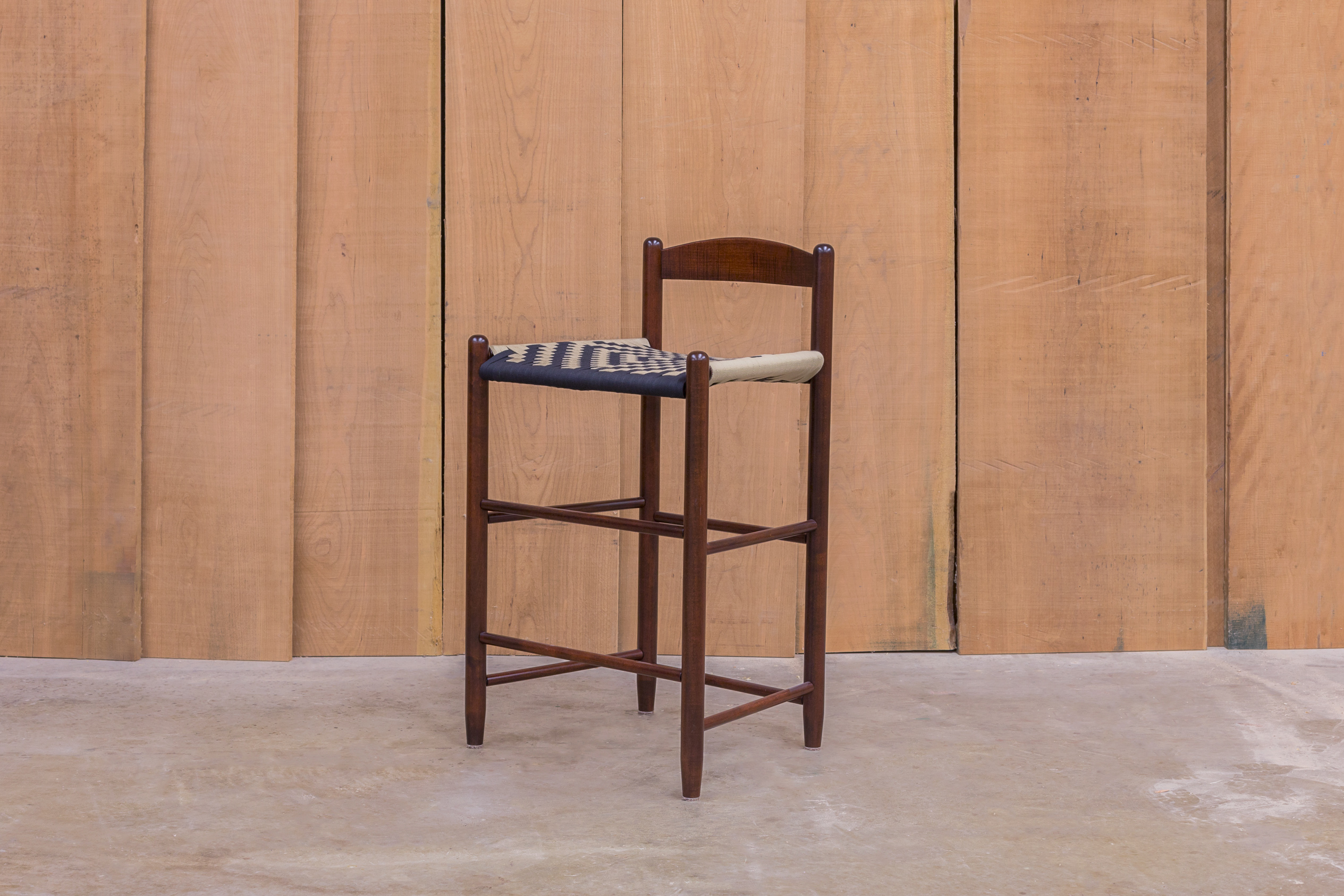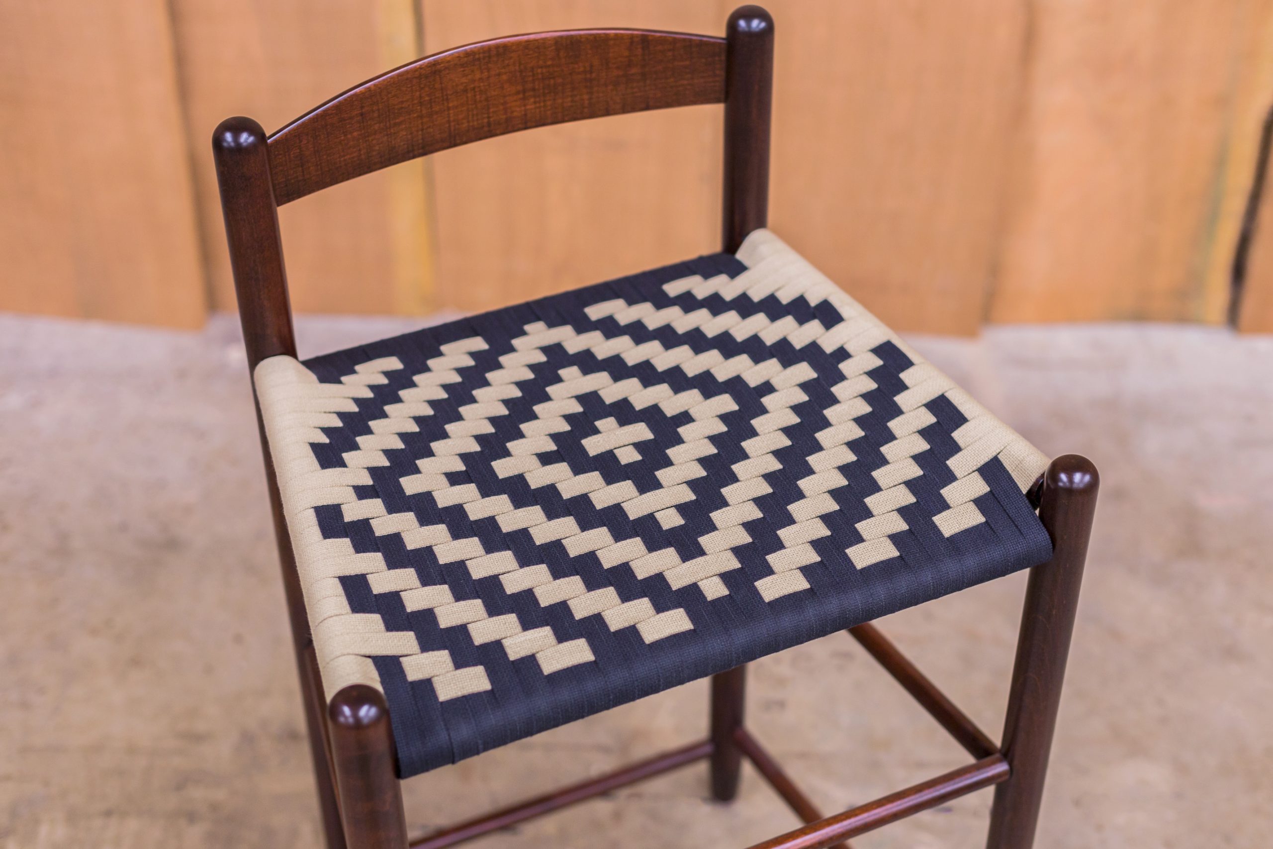 Low Bar Stool for a 36″ high counter. Tiger Maple wood in our Fireside finish with Black and Beige seat woven in a Diamond Pattern