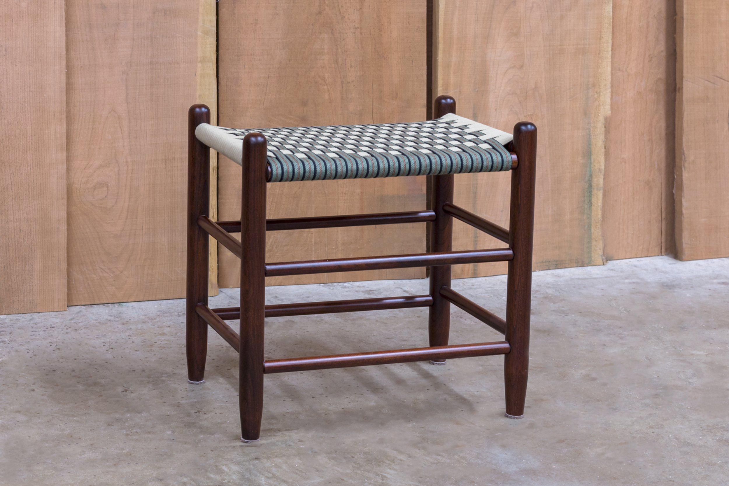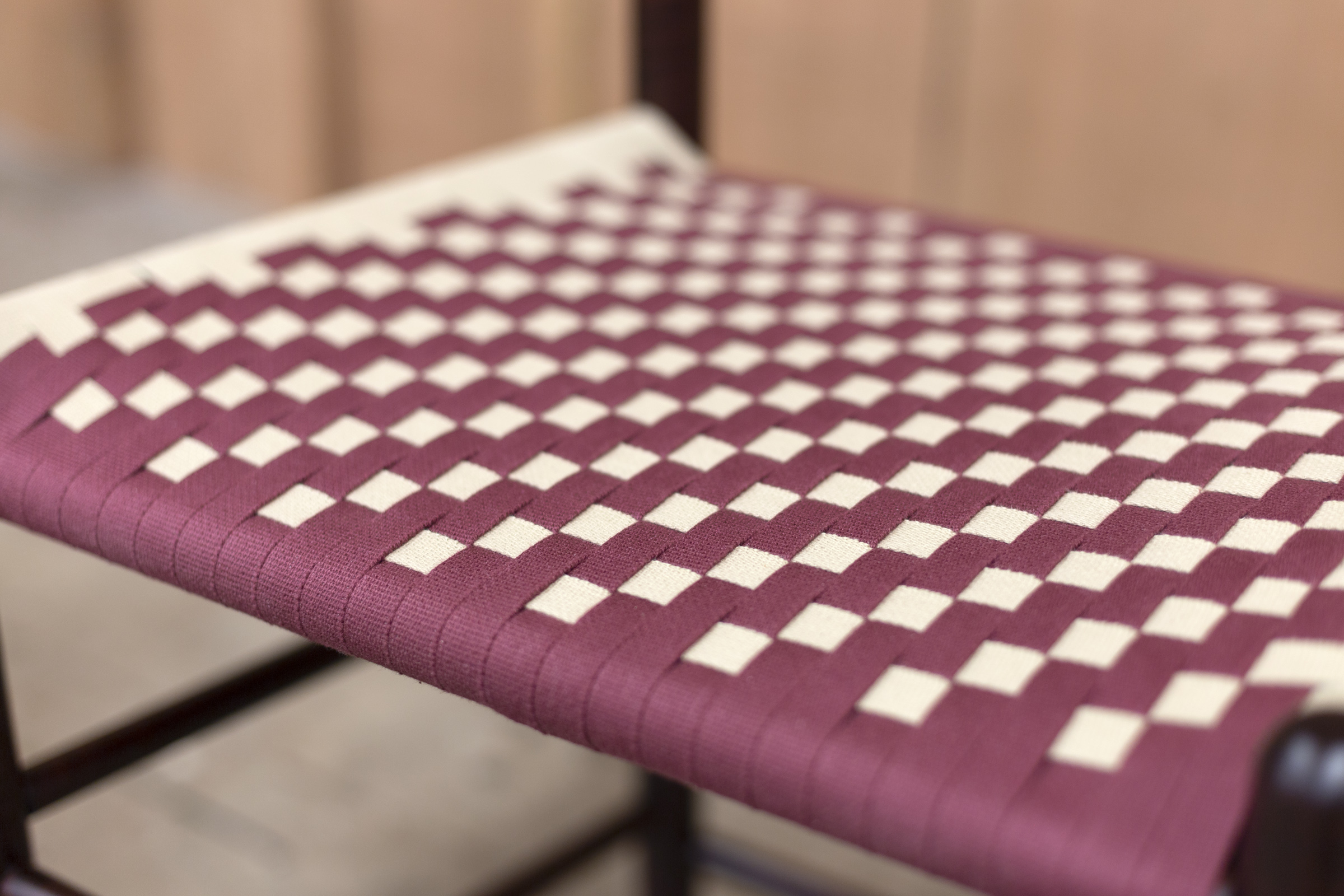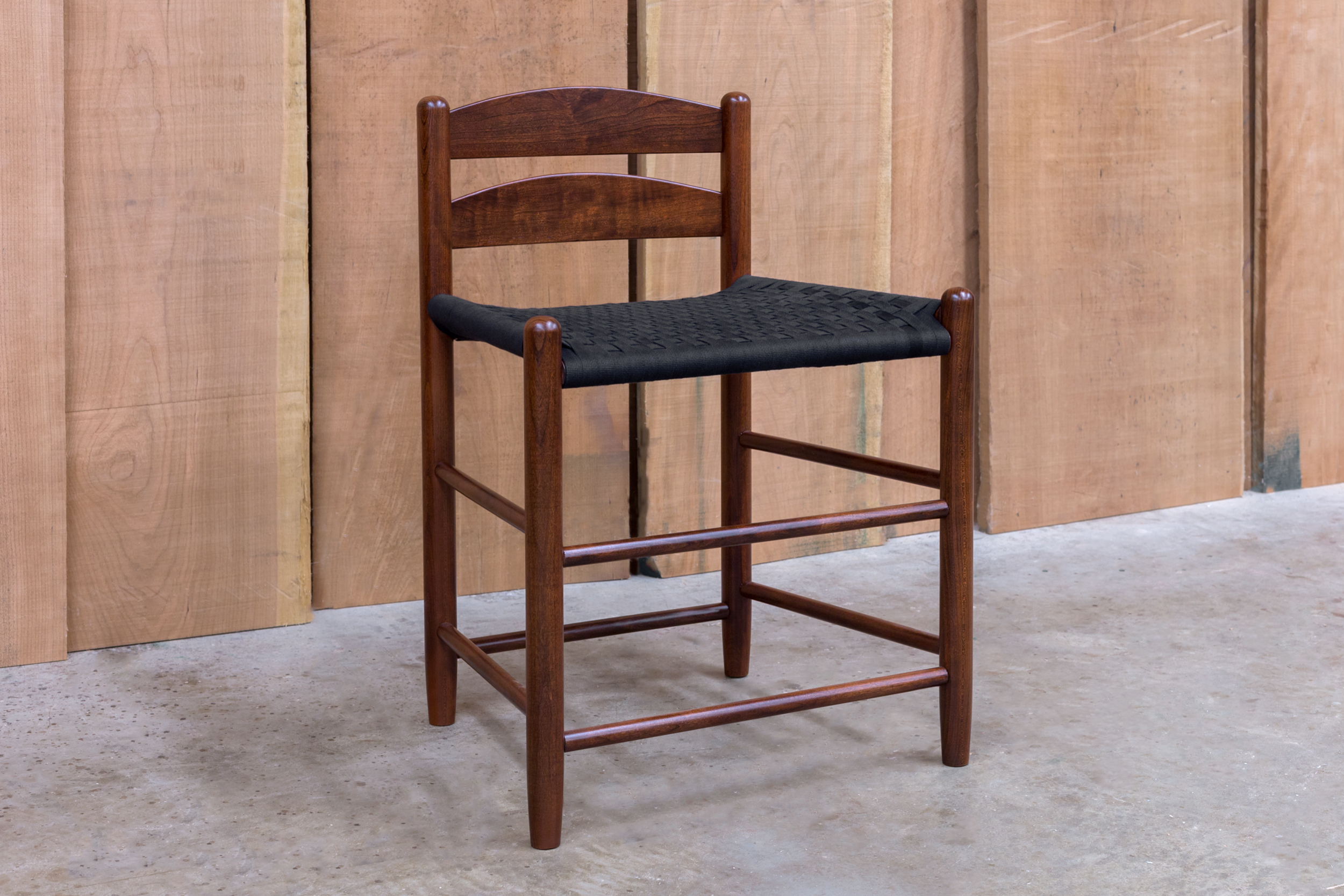 Low Bar Stool for a 36″ high counter. Tiger Maple wood in our Fireside finish with Black and Beige seat woven in a Diamond Pattern