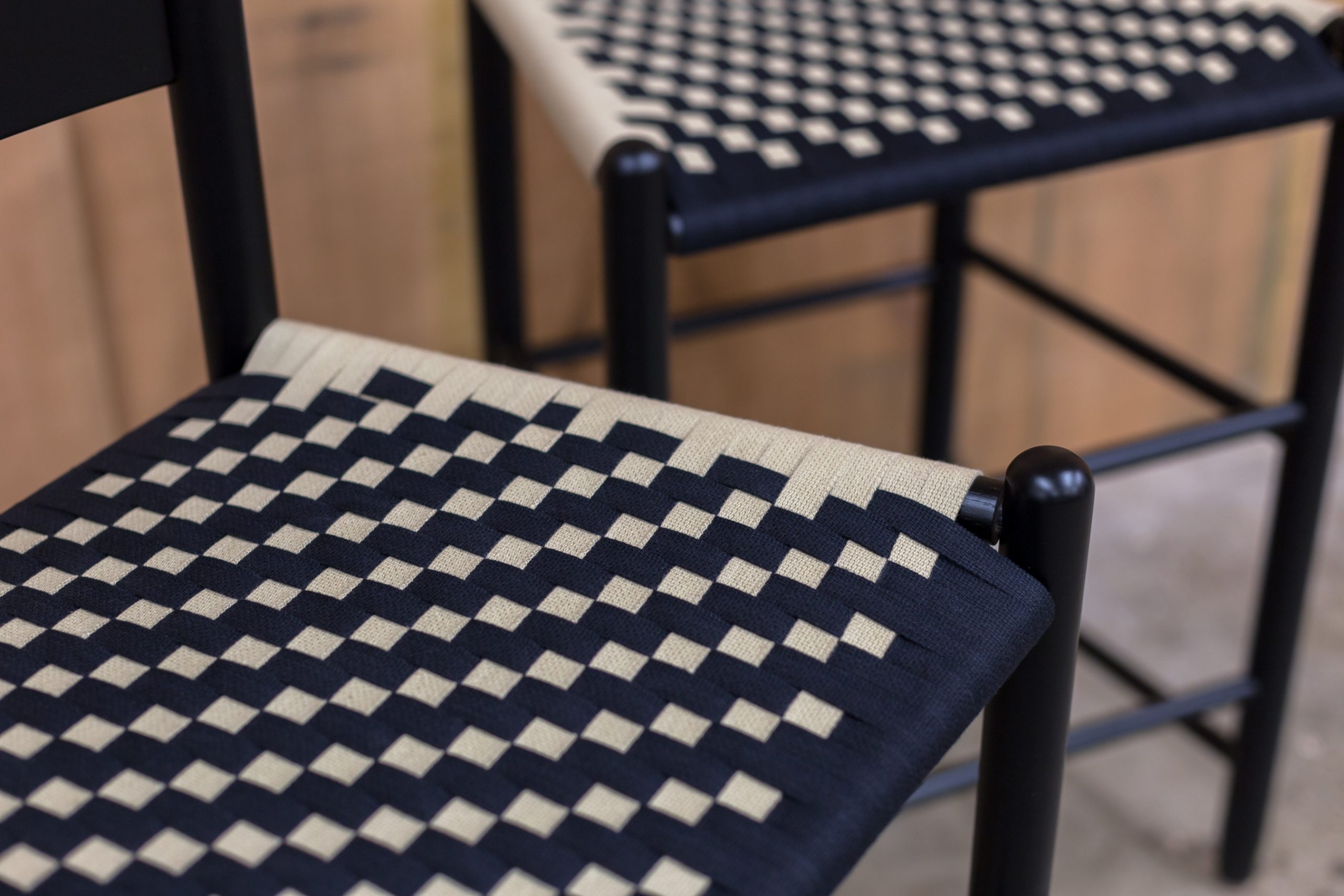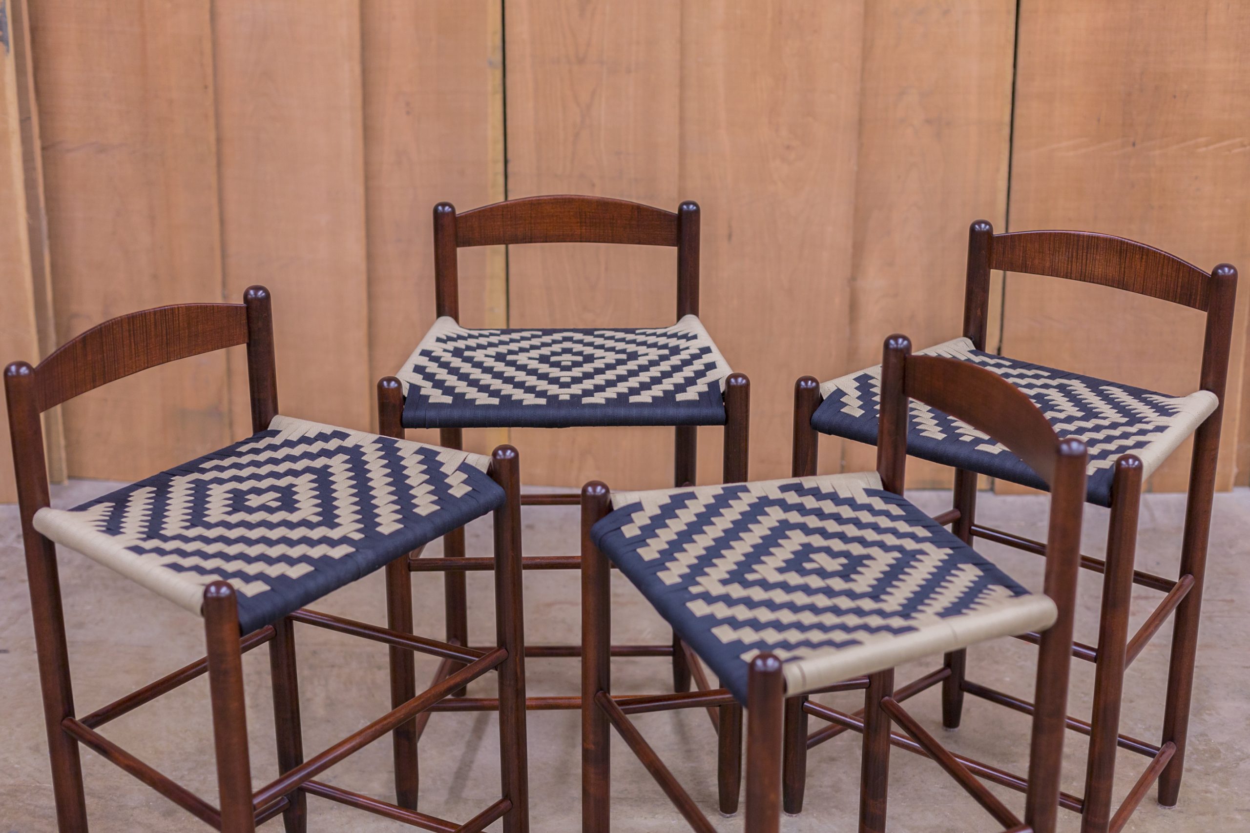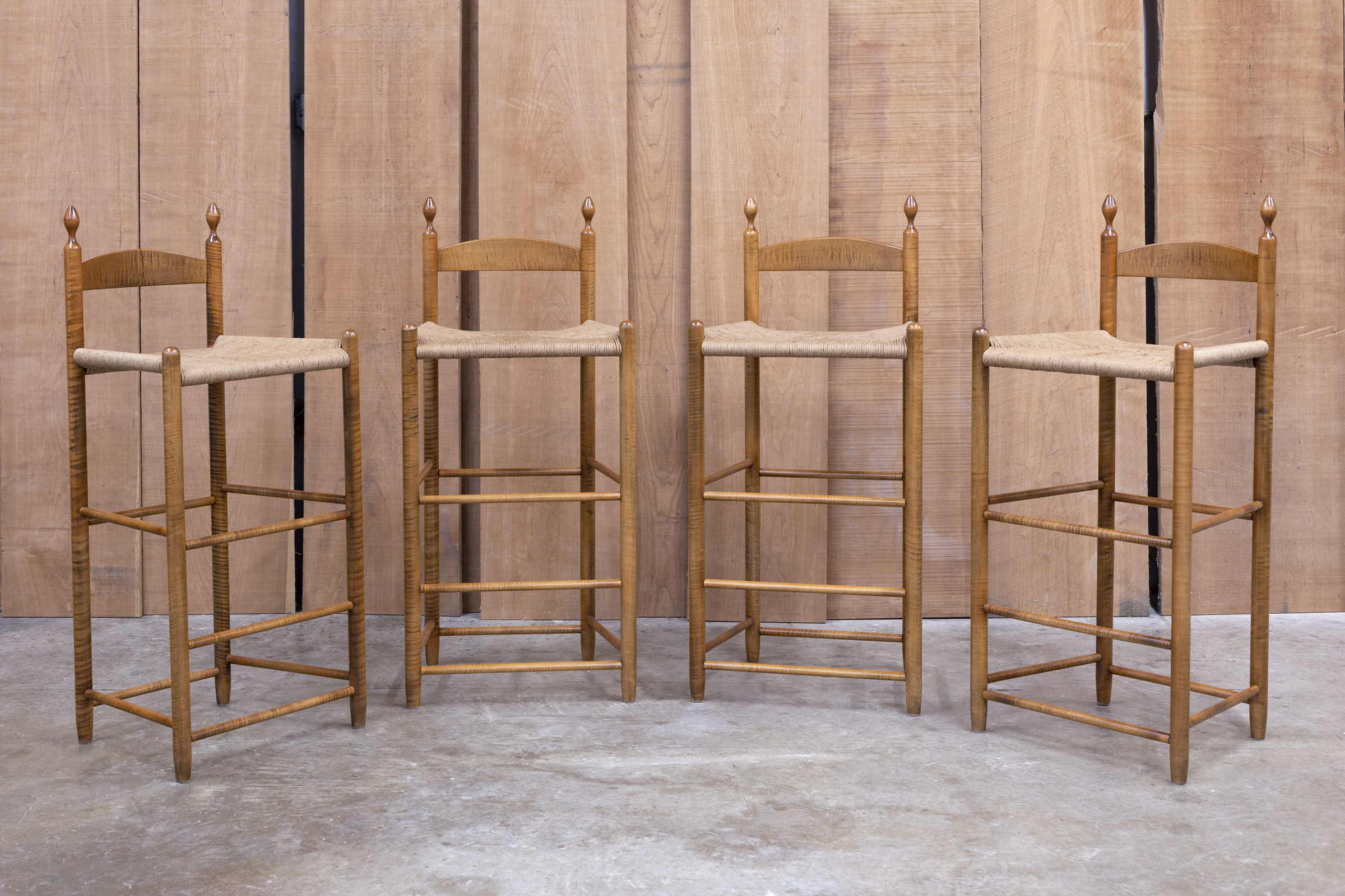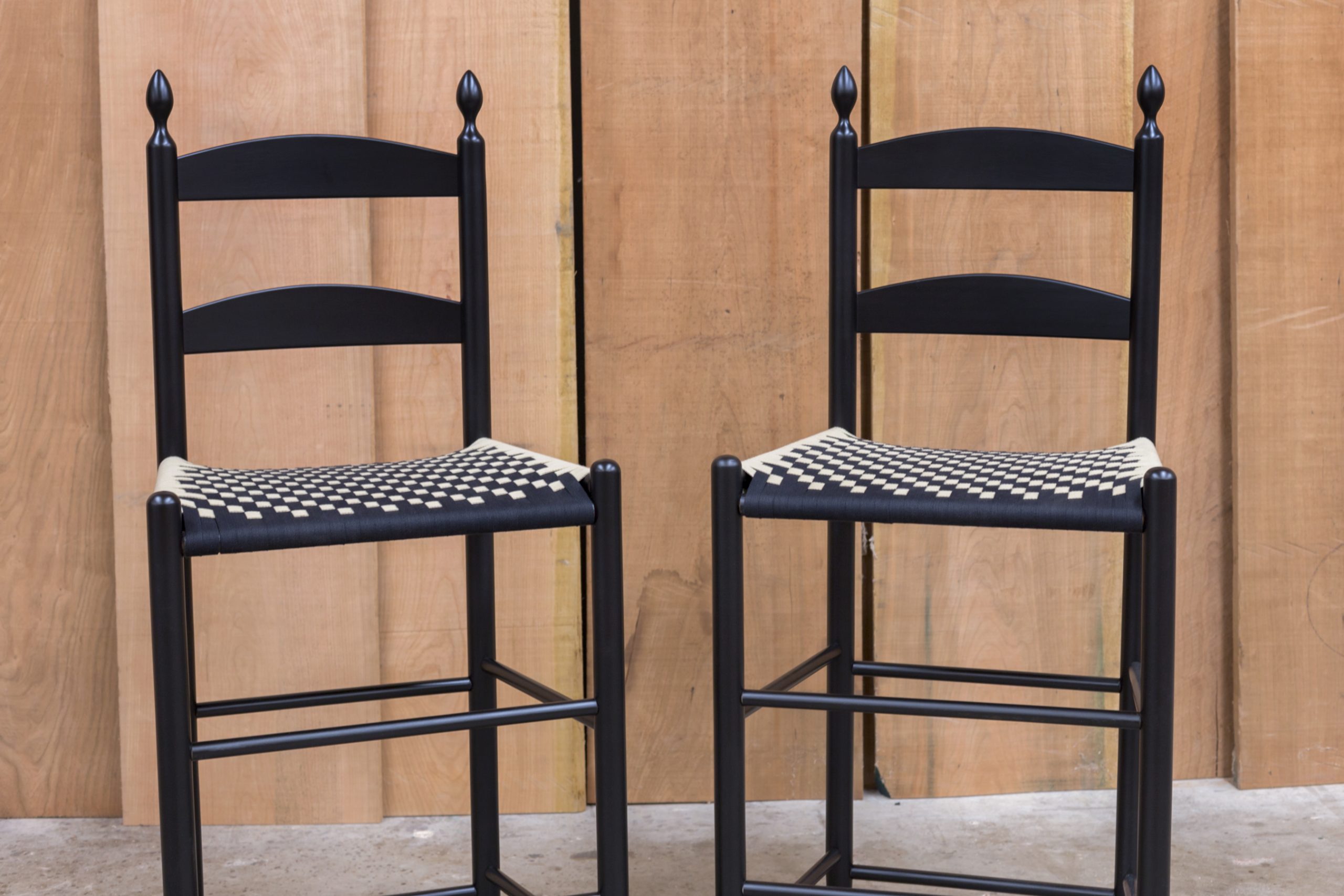 Set of Low Bar Stools for a 36″ high counter. Tiger Maple wood in our Fireside finish with Black and Beige seat woven in a Diamond Pattern
