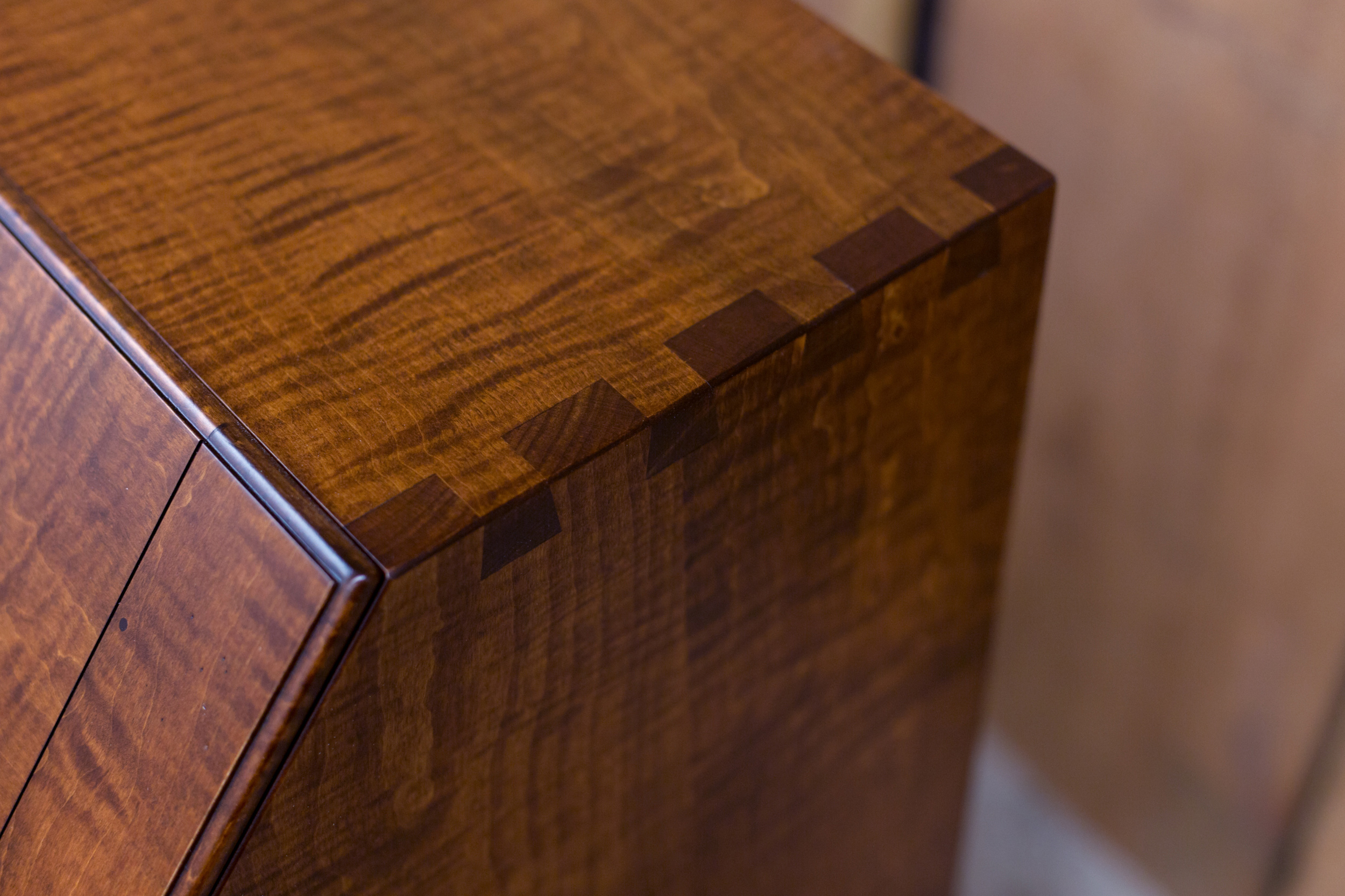 Dovetailed case corner on a Slant Front Desk built of Tiger Maple in our Cinnamon finish