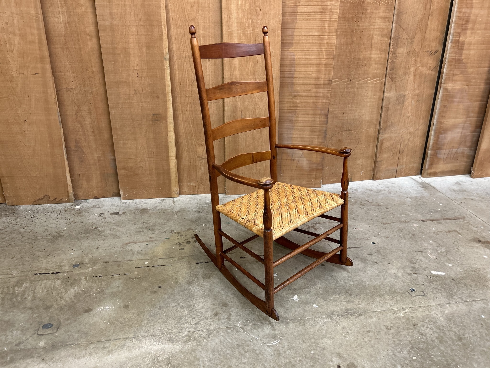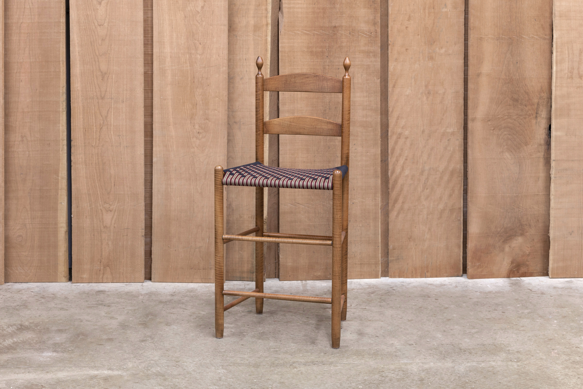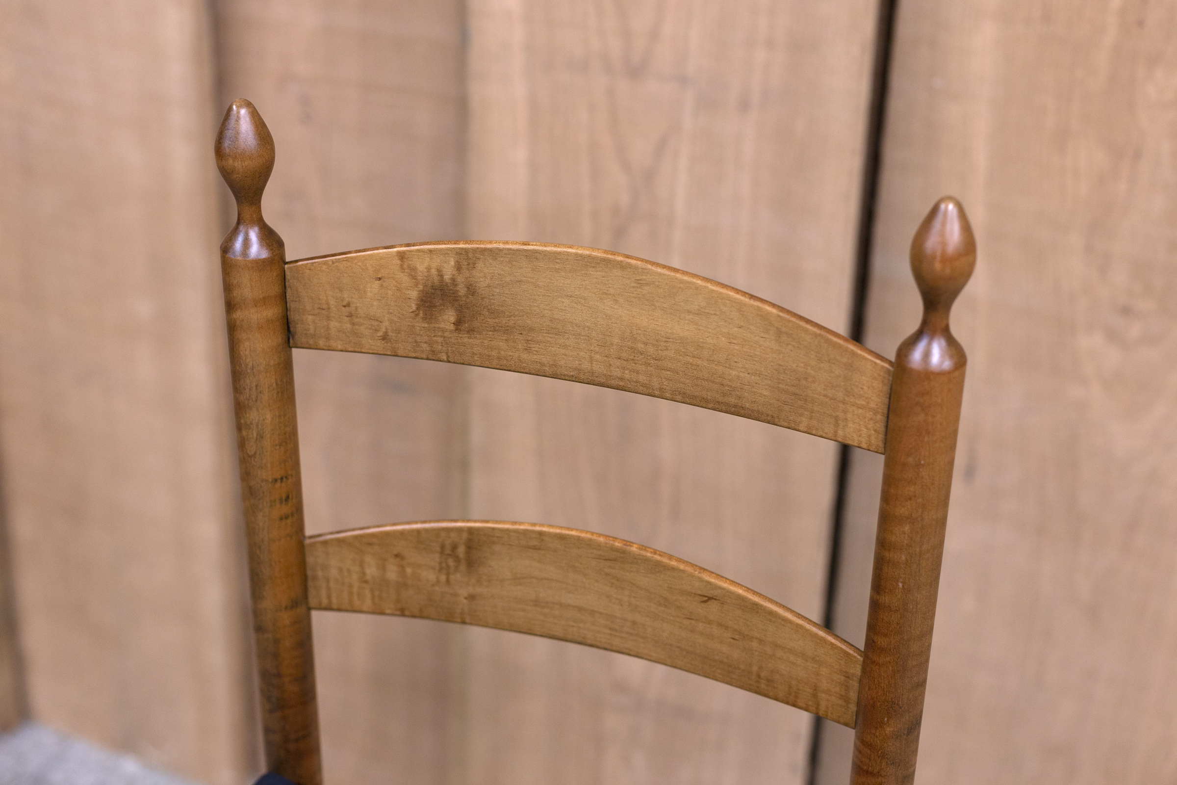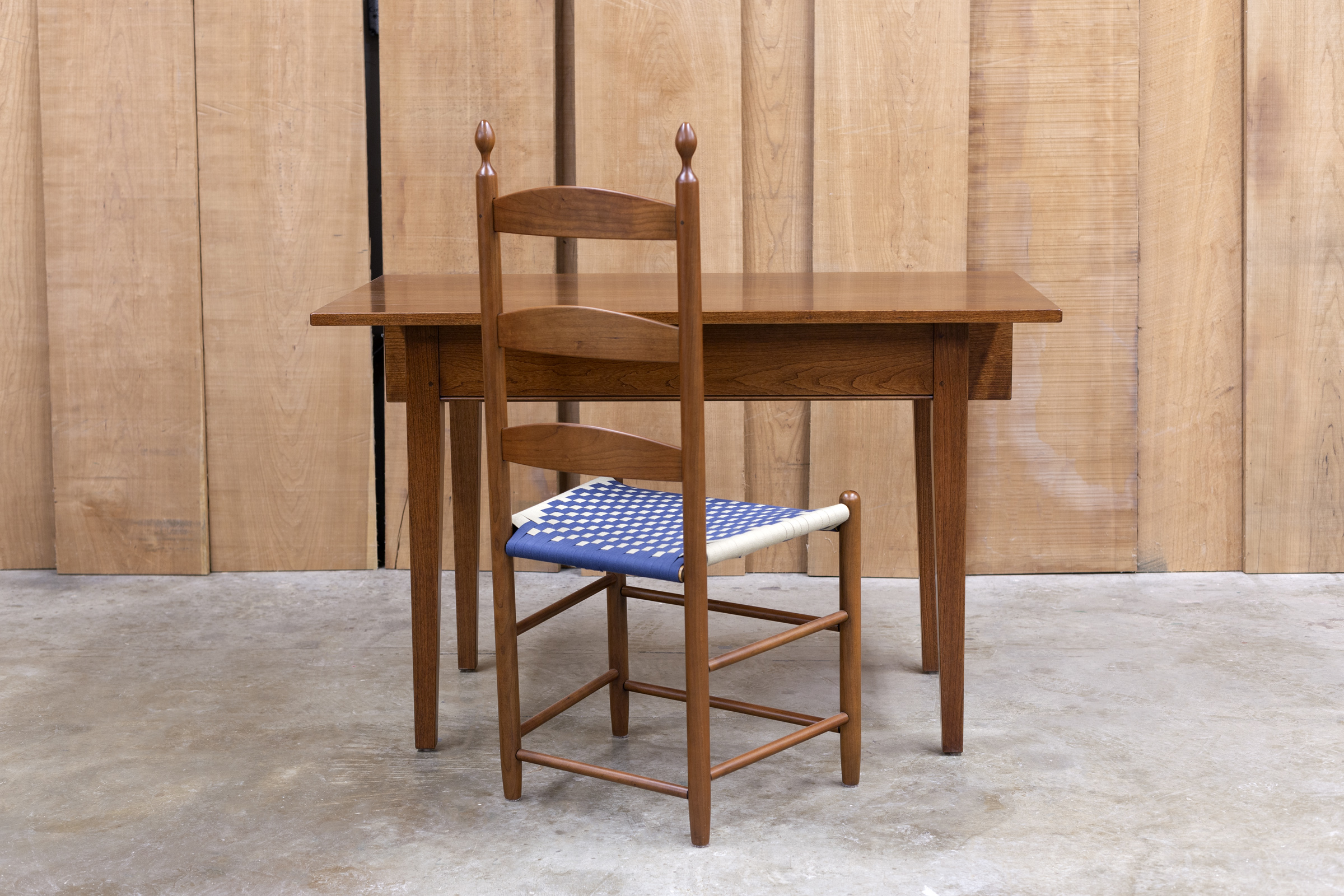 Dropleaf Card Table & 3 Slat Side Chair in Cherry wood in our Amber finish. Chair seat is woven with Dark Blue & Beige Shaker Tape