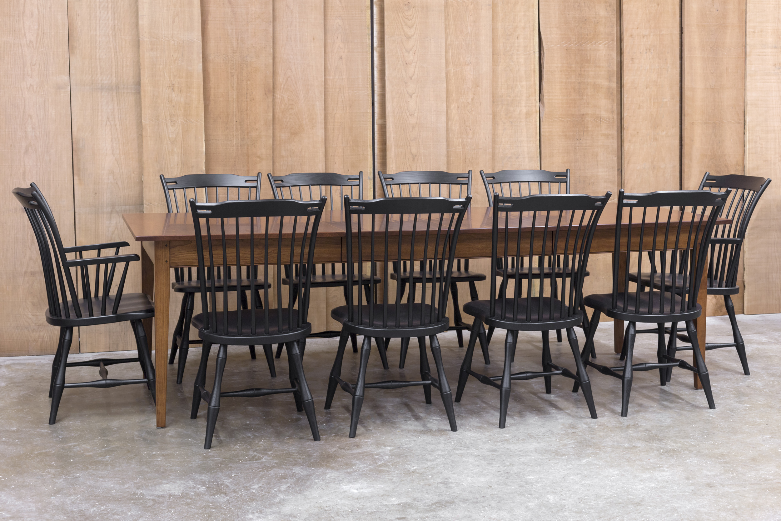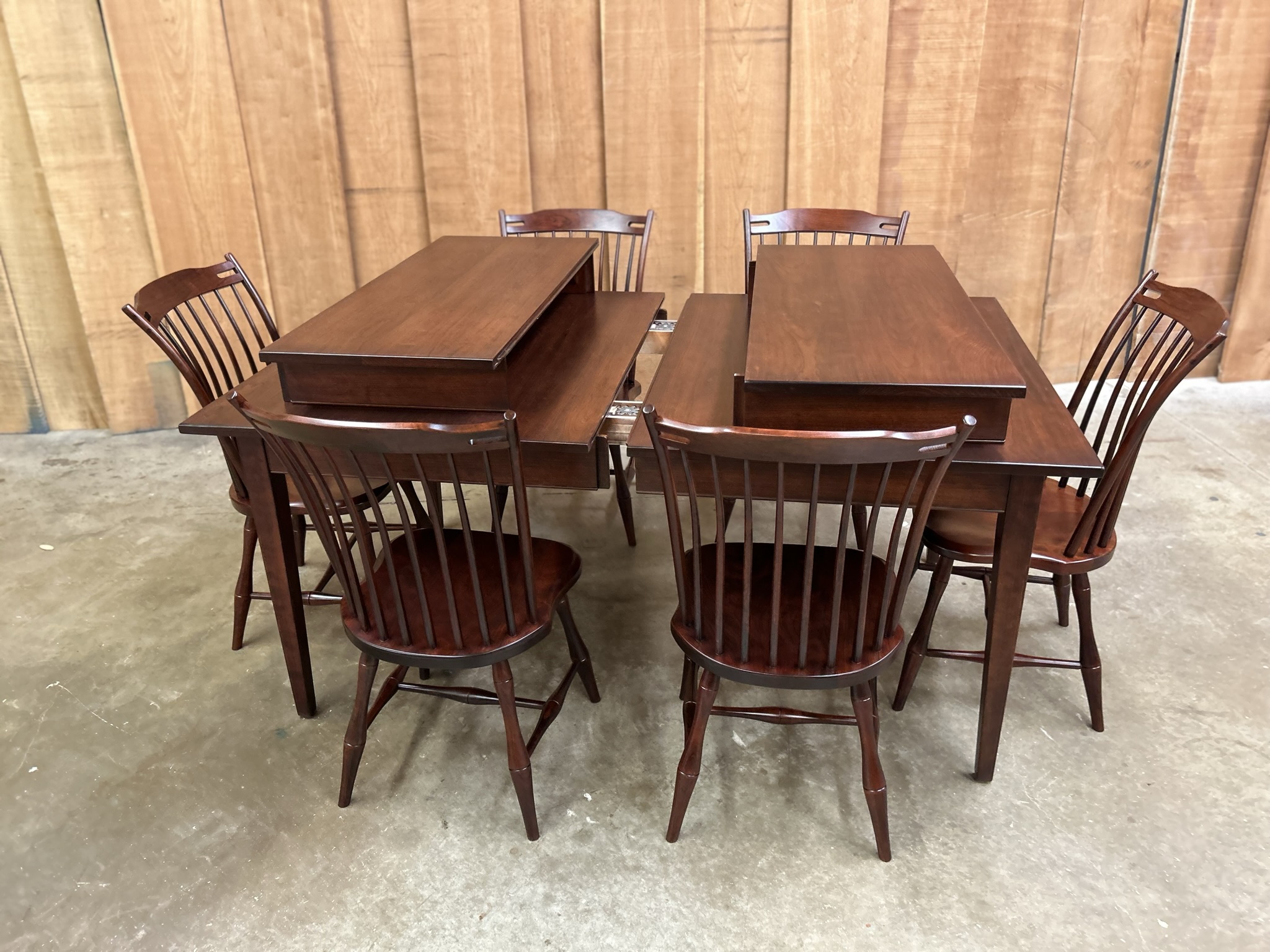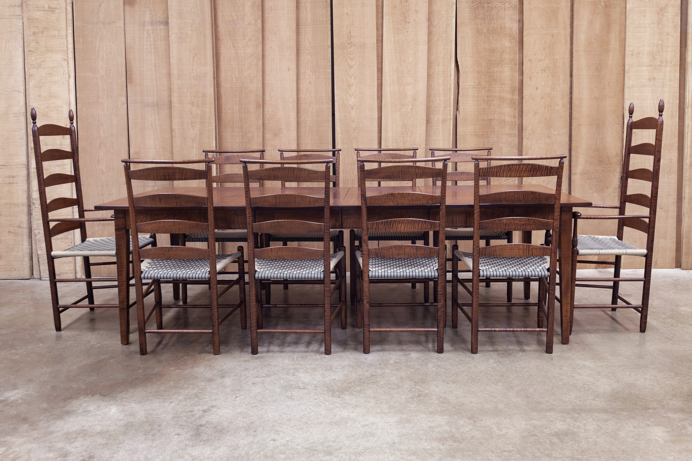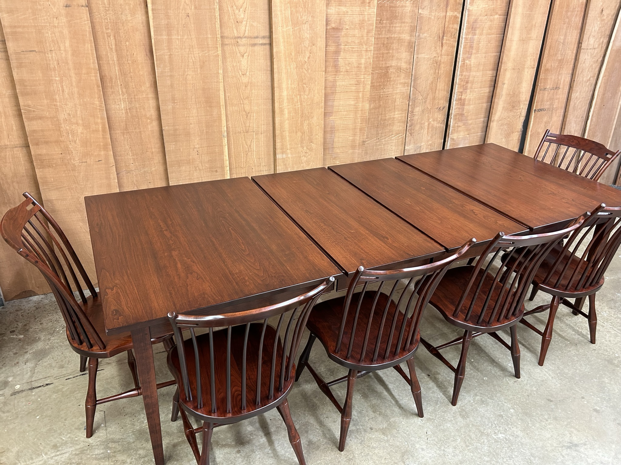 Extension Table built out of Tiger Maple wood in our Cinnamon finish with a set of Shawl Back Side Chairs and Elder’s Arm Chairs
