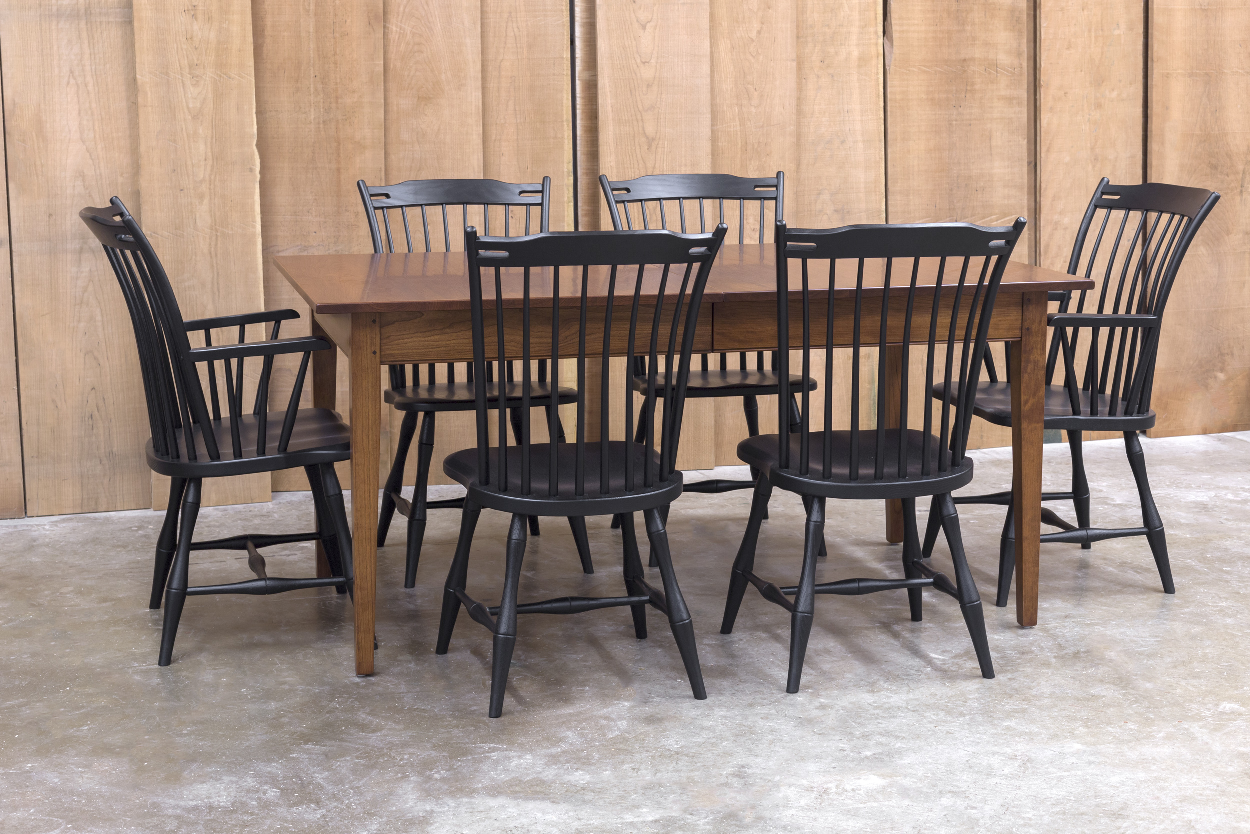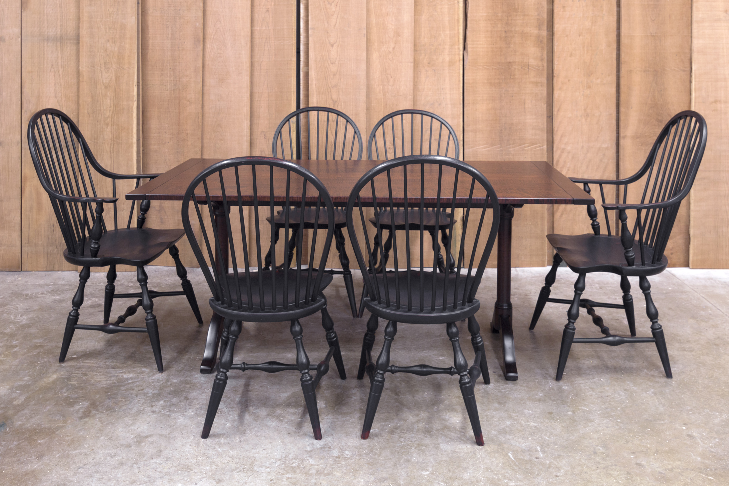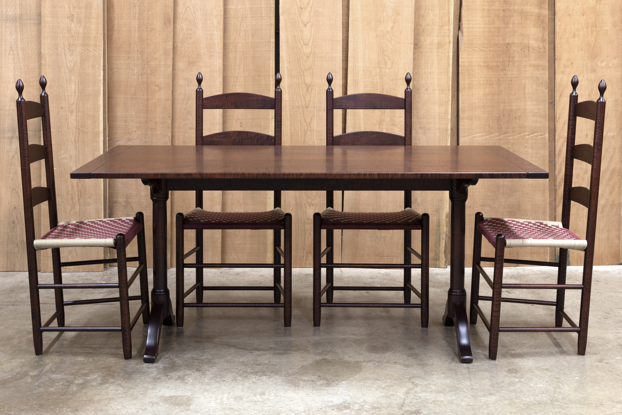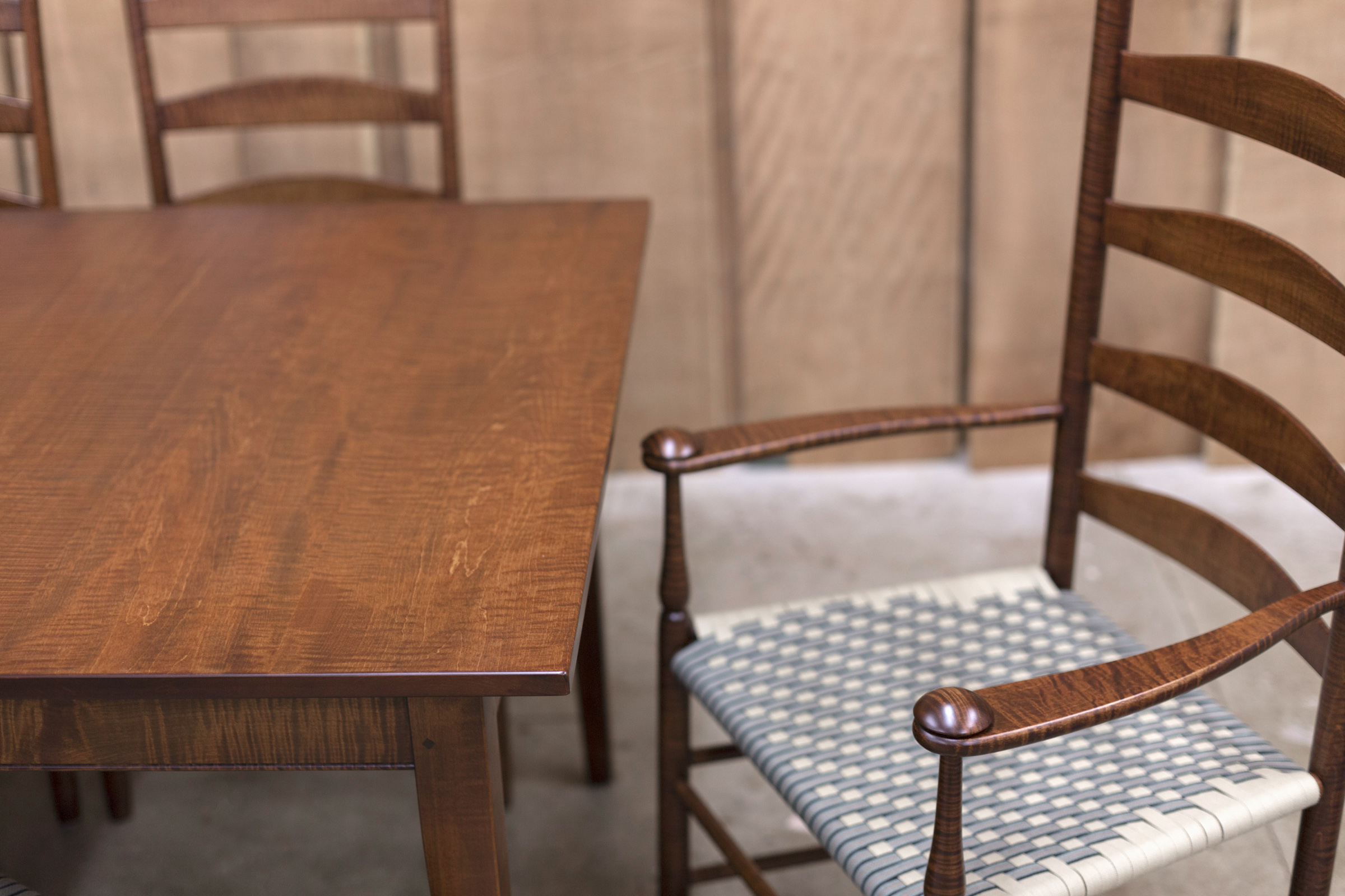 Extension Table built out of Tiger Maple wood in our Cinnamon finish with a set of Shawl Back Side Chairs and Elder’s Arm Chairs