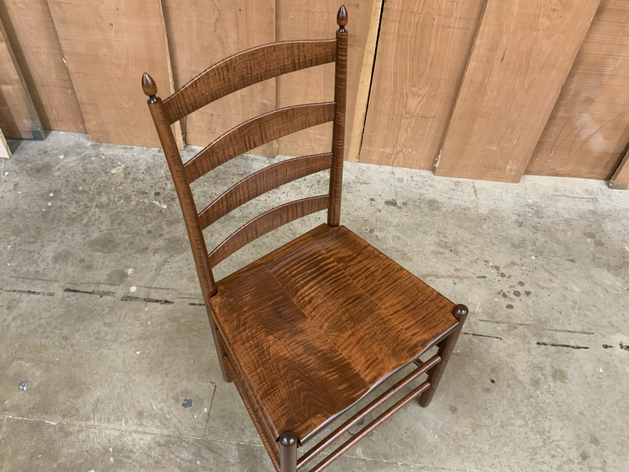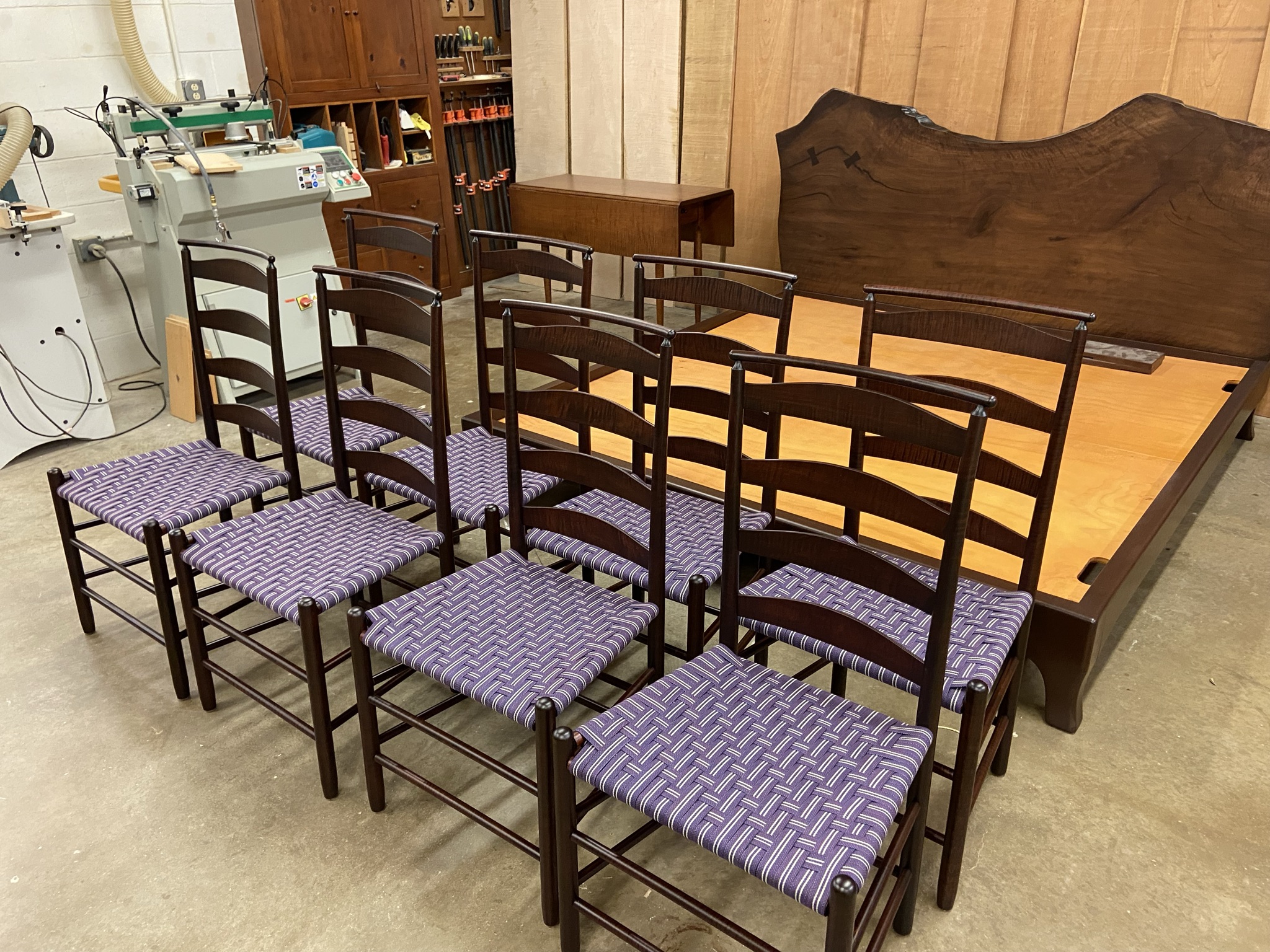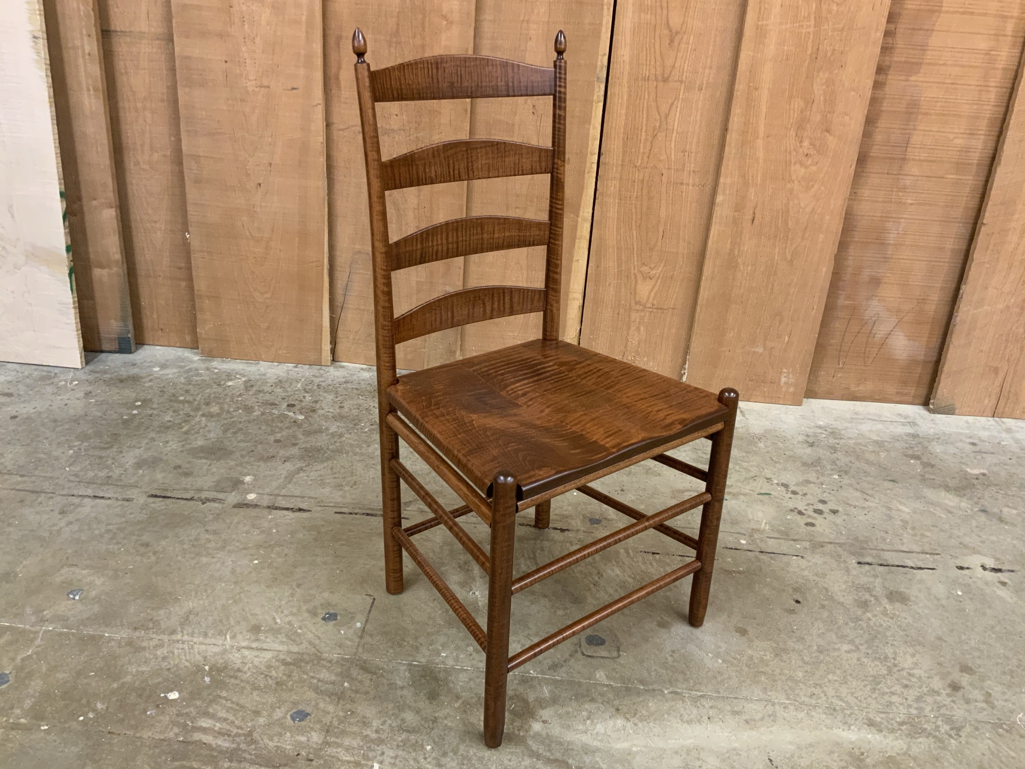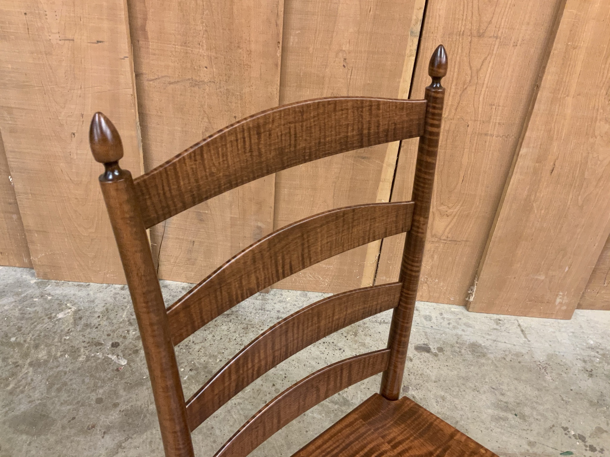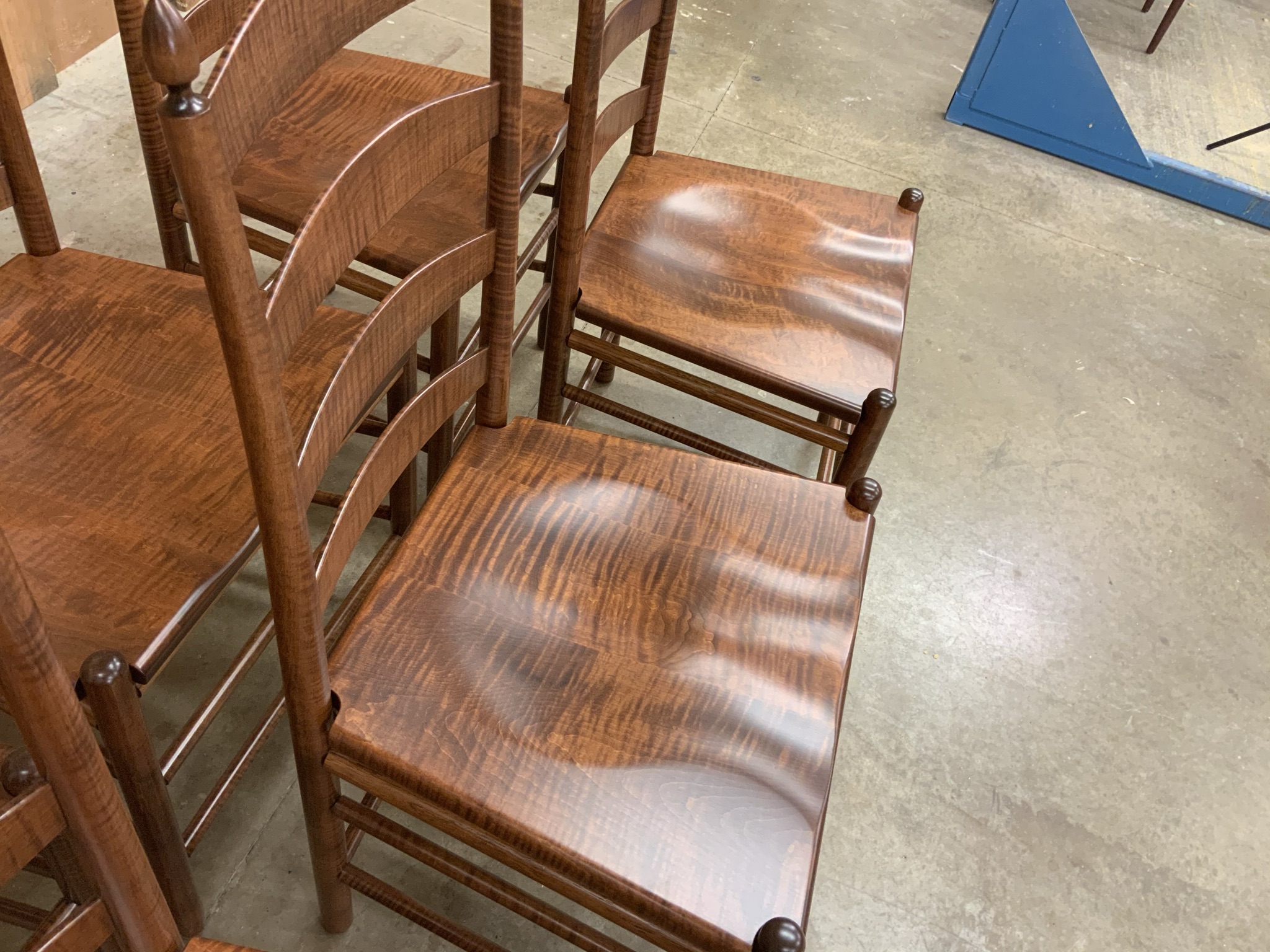 Extension Table built out of Tiger Maple wood in our Cinnamon finish with a set of Shawl Back Side Chairs and Elder’s Arm Chairs