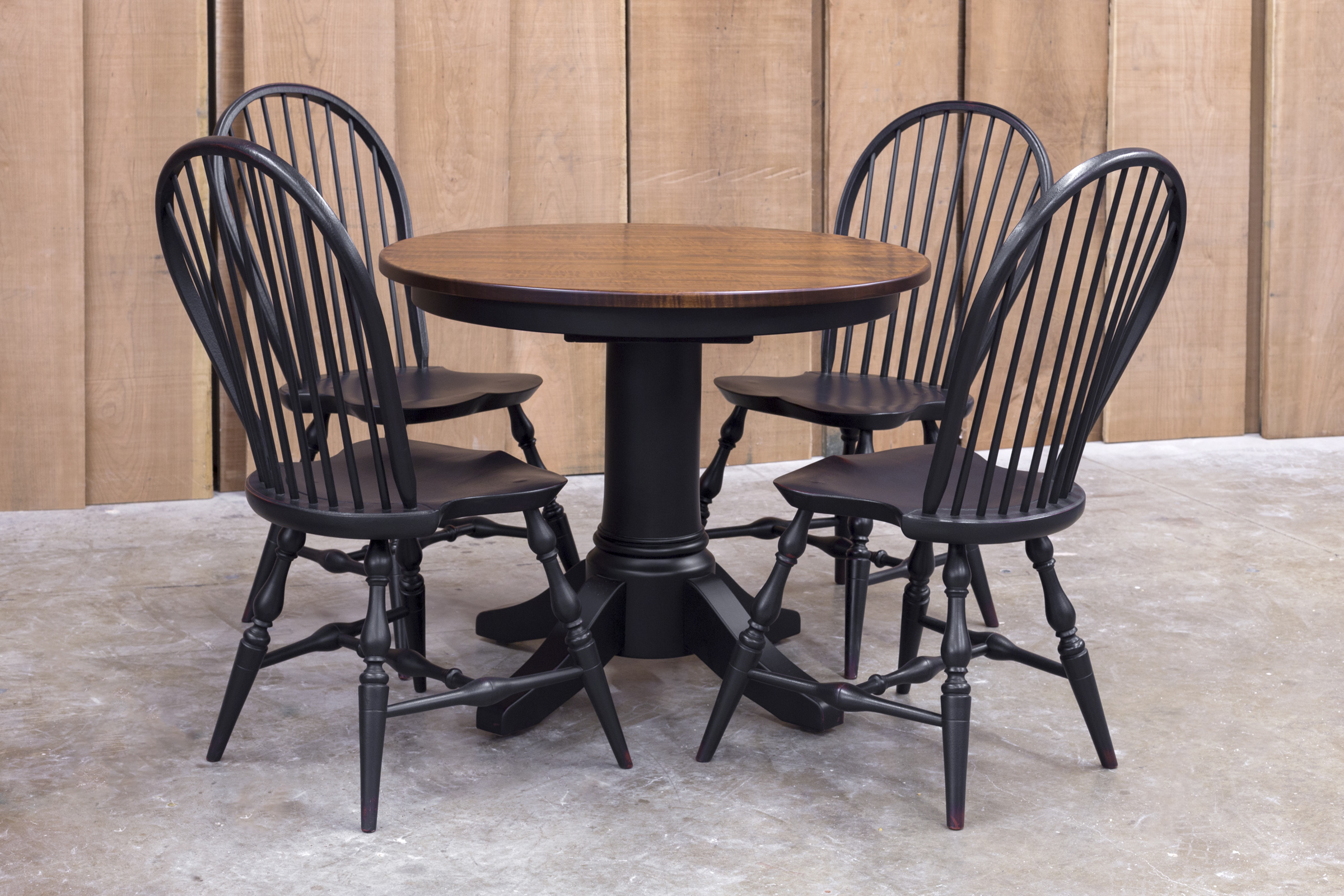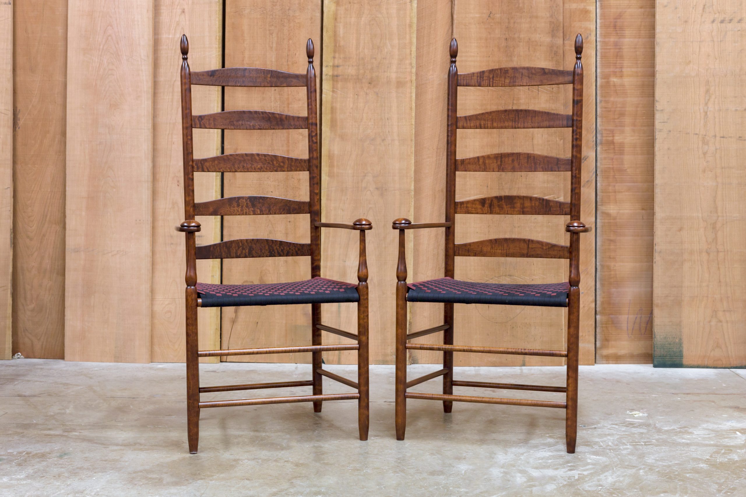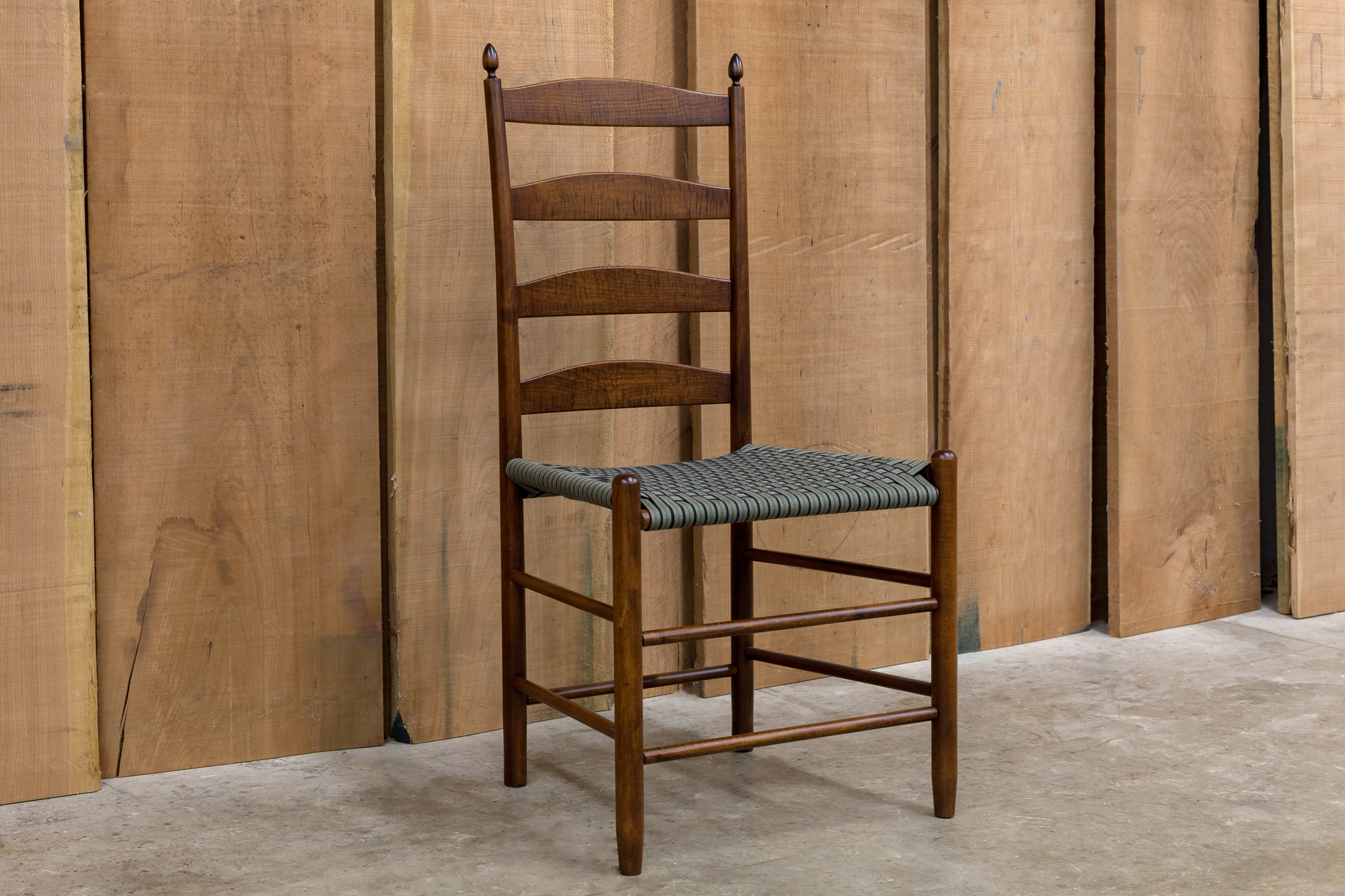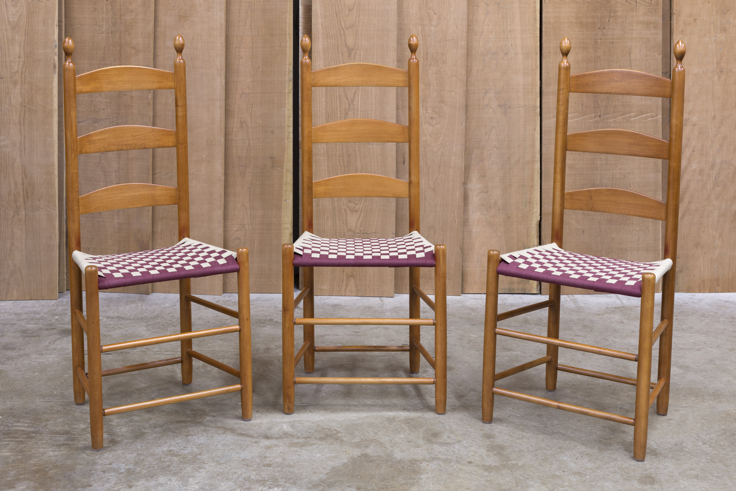 Extension Table built out of Tiger Maple wood in our Cinnamon finish with a set of Shawl Back Side Chairs and Elder’s Arm Chairs